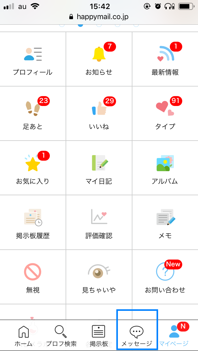 トップ画面で、「メッセージ」を選択します