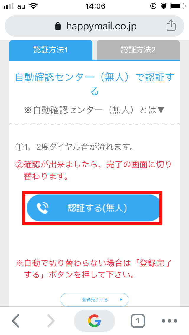 「認証する」をタップして、電話をかけます。人と話すわけではないので安心ください。