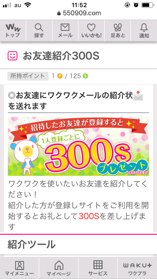 ワクワクメールを、ともだちに紹介して、その友達が登録して利用開始すると、300Sもらえます。
